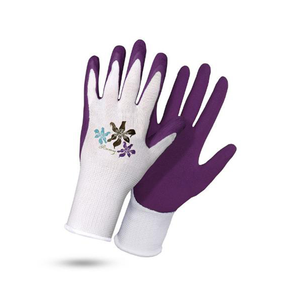 Charakteristika: Rukavice NERINE sú veľmi pohodlné vďaka efektu druhej kože, ktorý zabezpečuje jemné pletenie. Latexový povlak poskytuje odolnosť proti vlhkosti na dlani. Fialová farba poťahu a kvetinový znak robia rukavicu ľahko viditeľnou. Sú určené hlavné pre nenárocné práce v záhrade a v domácnosti pre upratovanie.