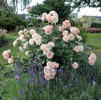 Kríková ruža s jemne aromatickými kvetmi intenzívnej oranžovej farby so zlatožltými tyčinkami.