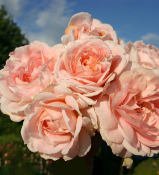 Elegantná plnokvetá stromčeková ruža s romantickými marhuľovými kvetmi.