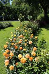 Kríková ruža s jemne aromatickými kvetmi intenzívnej oranžovej farby so zlatožltými tyčinkami.