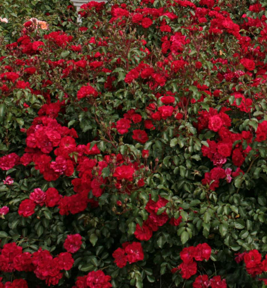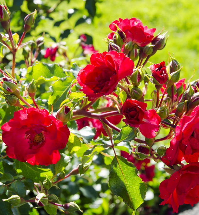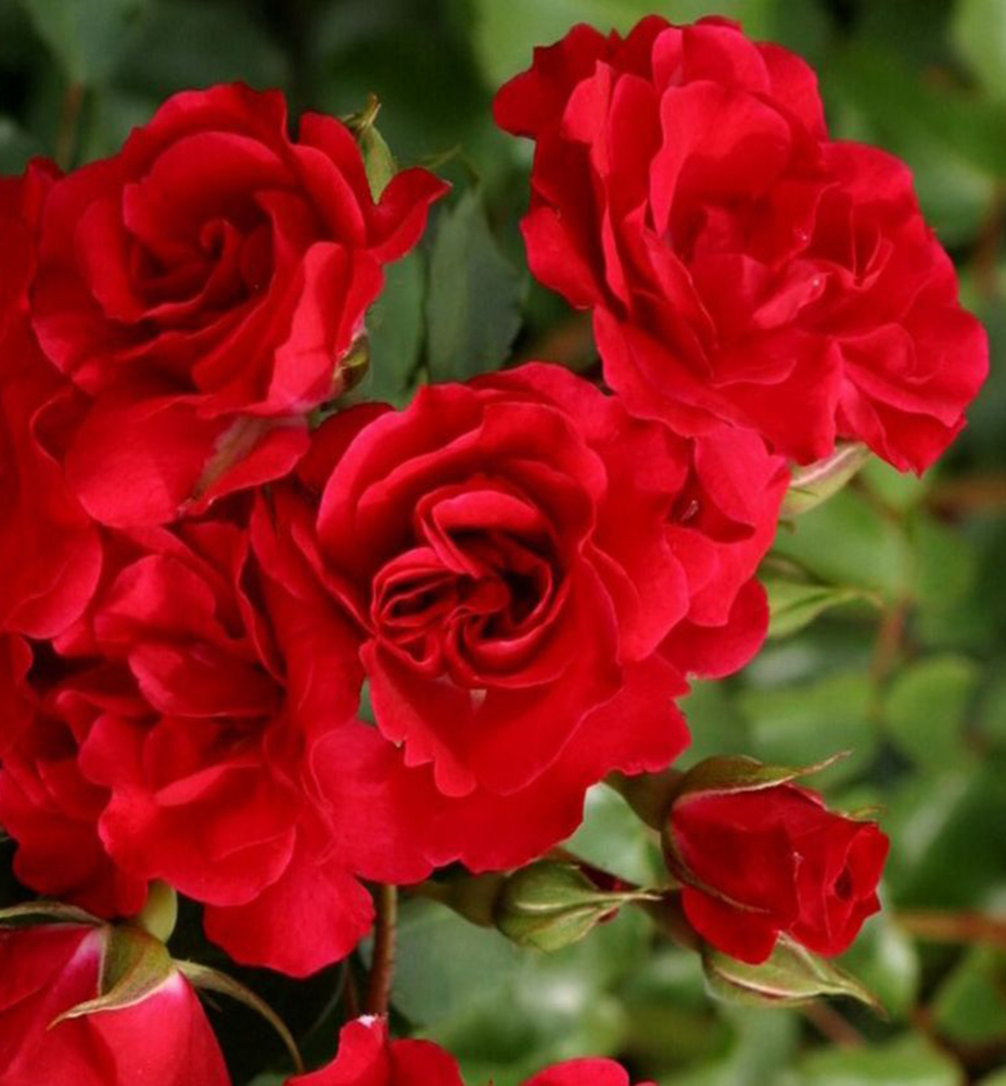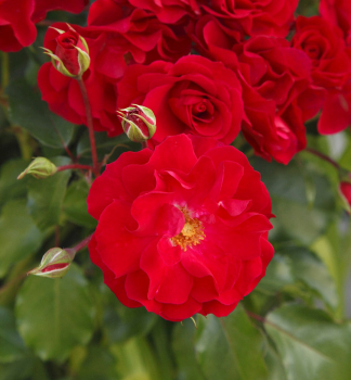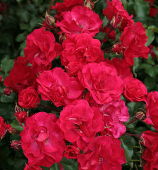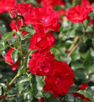 Neprehliadnuteľná ruža s poloplnými intenzívne červenými kvetmi atraktívnymi pre včely.