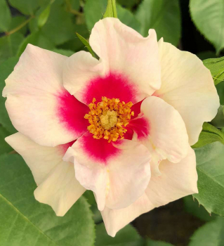 Charakteristika: Kultivar mnohokvetej ruže ´SEE YOU IN PURPLE´ je novinkou na trhu, vyšľachtenou v roku 2018, ktorá sa nápadne líši od ostatných druhov. Kombinuje výnimočný vzhľad kvetov a kompaktný vzpriamený rast rastliny. Jednoduché krémové kvety s nádychom ružovej po rozkvitnutí ponúkajú pohľad na intenzívne sfarbené purpurové očko so žltými tyčinkami v strede kvetu.