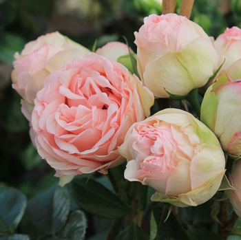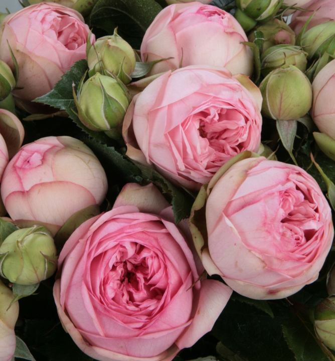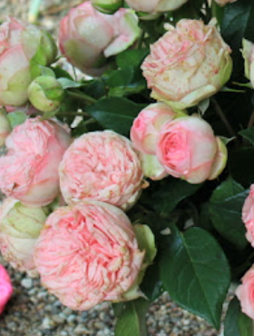 Mnohokvetá ruža s plnými nostalgickými kvetmi romantickej ružovej farby.