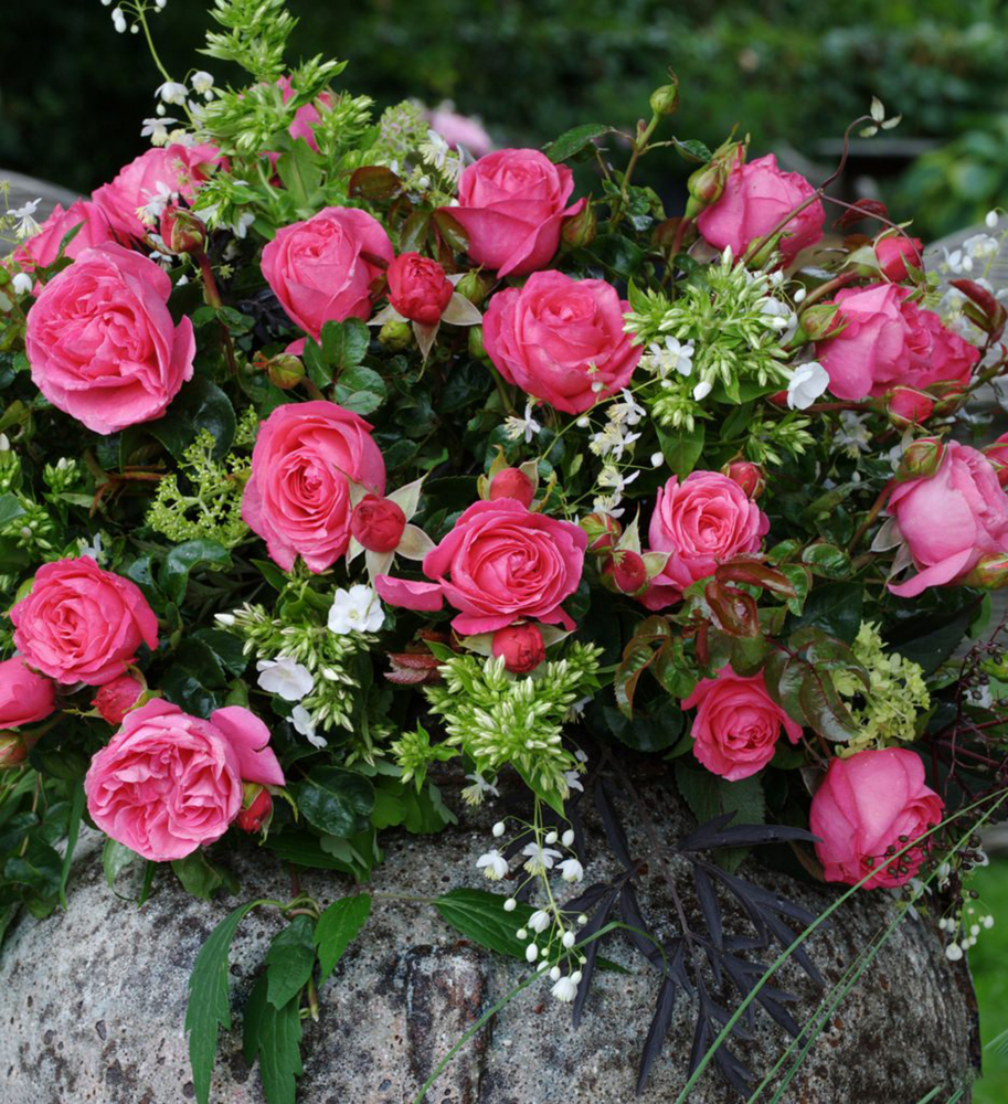 Mnohokvetá ruža s plnými nostalgickými kvetmi romantickej ružovej farby.