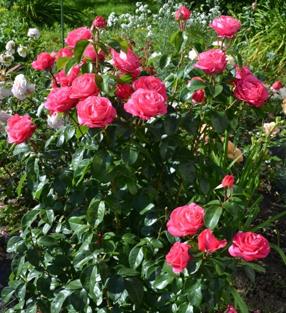 Bohato kvitnúca ruža s jasnými lososovo ružovými kvetmi rozžiari každú záhradu.