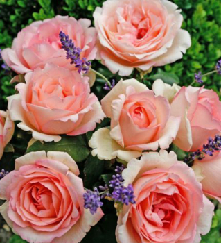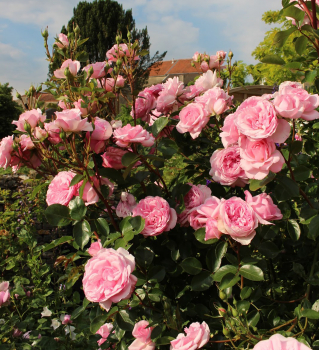 Mnohokvetá ruža s plnými nostalgickými kvetmi romantickej ružovej farby.
