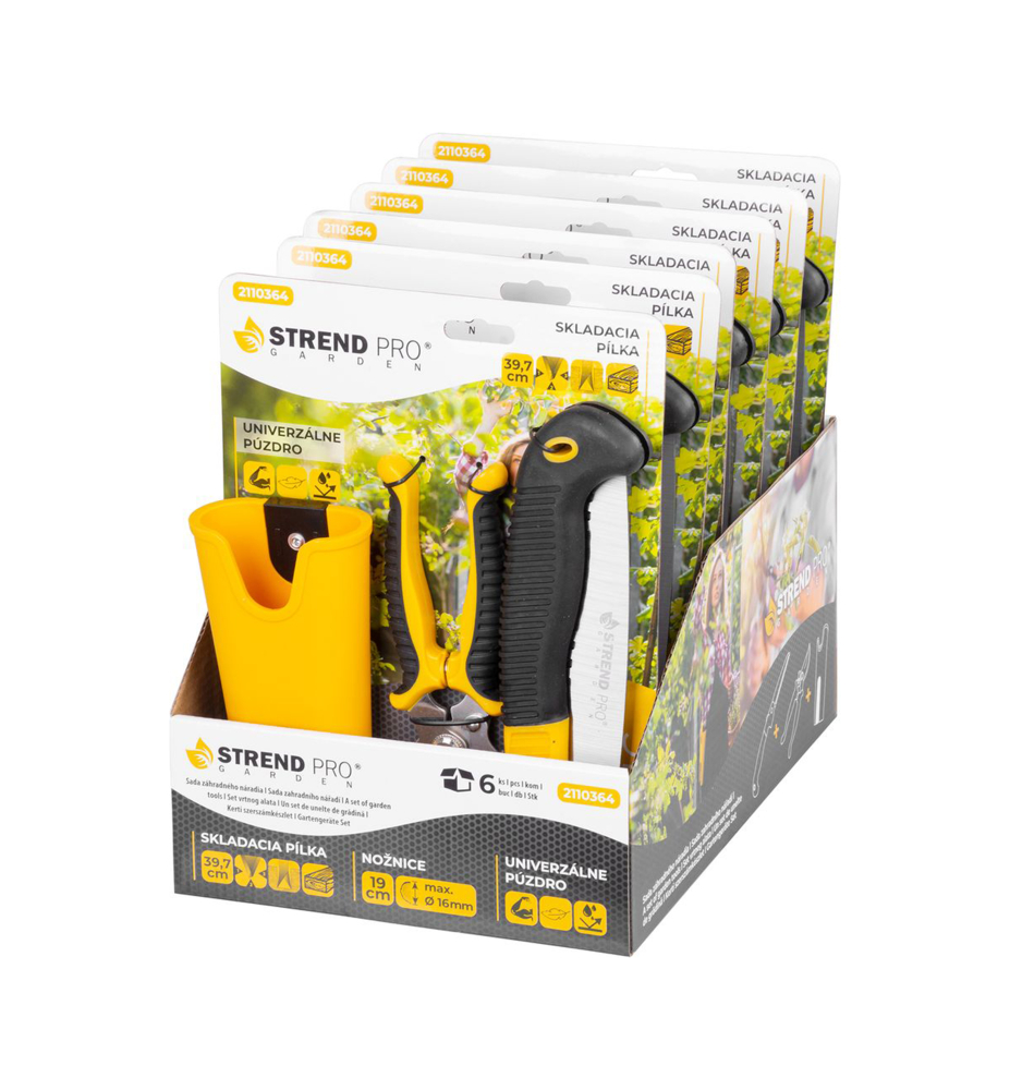 Sada obsahuje: záhradné nožnice 190 mm, skladacia pílka 397 mm, univerzálne puzdro