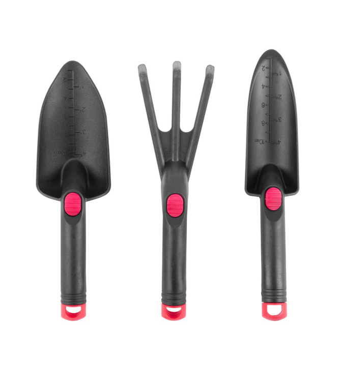 Charakteristika: Táto 3-dielna sada je určená na jednoduché záhradkárske práce. Sada obsahuje širokú lopatku, úzku lopatku a kyprič. Náradie je vyrobené z kvalitného plastu.