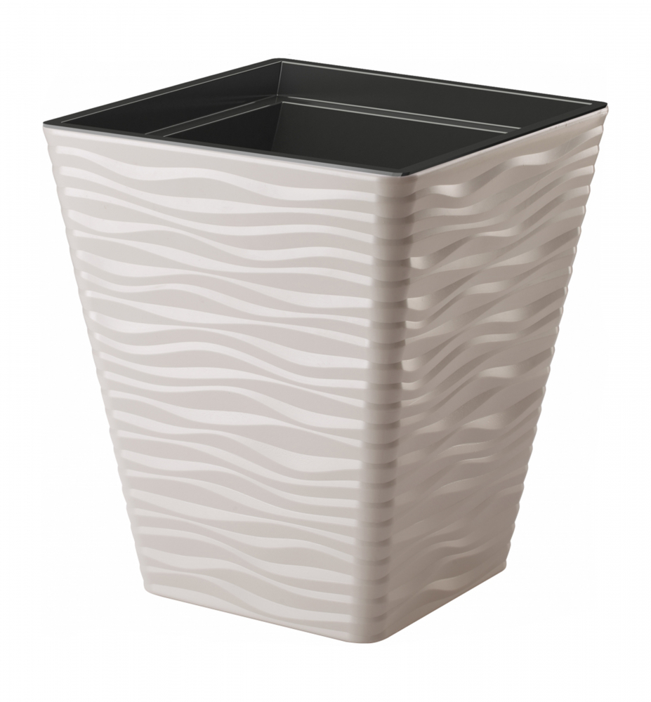 Charakteristika: Kvetináč Sahara s vnútornou vložkou na vysadenie rastlinami je vyrobený z odolného plastu. Je mrazuvzdorný, UV stály a vyznačuje sa vyššou pevnosťou materiálu. Moderný trendový vzhľad vlny je rovnomerne po celom obvode nádoby. Sahara je z matného plastu a vlny sa zvýraznili vysoko lesklým lemom. Je možné ho umiestniť do interiéru aj vonkajších priestorov. Má tvar kvadrátu. Farba: holubia sivá.