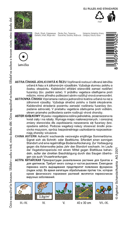 Charakteristika: Astra ihlicovitá je jednoročná rastlina z kategórie obľúbených moderných kultivarov. Balenie obsahuje vzpriamene rastúce astry s modrými ihlicovitými lupeňmi. Tento kultivar rastie do výšky približne 60 cm, vynikne vysadený v záhone alebo v kvetináčoch v kombinácii s inými letničkami. Kvety sú vhodné k rezu.