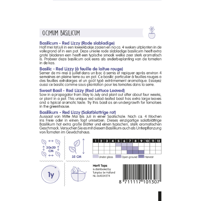Charakteristika: Bazalka ´RED LIZZY´s veľkými listami fialovej až čiernej farby, nájde uplatnenie v čerstvom aj sušenom stave v rámci prípravy a dochutenia pokrmov. Odroda vyniká silnou arómou. Okrem využitia v kuchyni ju môžeme pestovať aj pre jej liečivé účinky pri uvoľňovaní kŕčov, žalúdočných problémoch a nechutenstve. Pomáha tiež pri uštipnutí hadom a na upokojenie nervov.