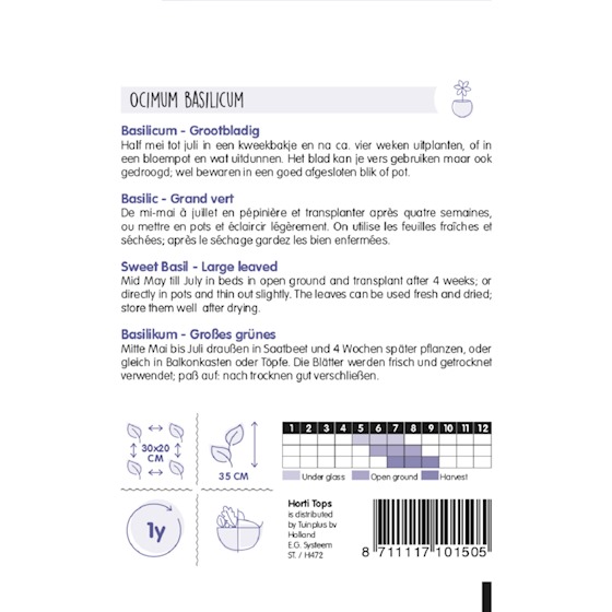 Charakteristika: Balenie rastlinného osiva sladkej bazalky s veľkými listami, ktoré nájdu uplatnenie v čerstvom aj sušenom stave v rámci prípravy a dochutenia pokrmov. Okrem využitia v kuchyni ju môžeme pestovať aj pre jej liečivé účinky pri uvoľňovaní kŕčov, žalúdočných problémoch a nechutenstve. Pomáha tiež pri uštipnutí hadom a na upokojenie nervov.