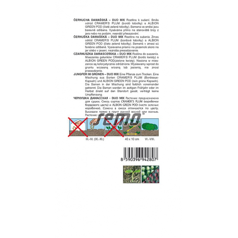 Charakteristika: Černuška damašská "Perzské šperky" je rýchlo rastúca letnička so vzpriameným rastom, ktorá pochádza zo Stredomoria. Je vhodná do letničkových výsadieb a do truhlíkov. Kvitne od júna do septembra, kvety sú vhodné k rezu a na sušenie. V balení sa nachádzajú semená s bielymi, modrými a ružovými kvetmi. Pestuje sa najmä kvôli tobolkám, ktoré sa tvoria z odkvitnutých kvetov. Tobolky sa sušia a používajú do aranžmánov. Dorastá do výšky 50 cm.