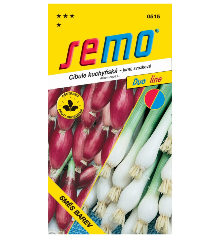 Charakteristika: Zmes semien výbornej jarnej lahôdkovej cibuľky ´DUO´, ktorá je vhodná do polievok, omáčok, nátierok a šalátov. Vňať je bohatá na vitamín C. Je to skutočná delikatesa medzi cibuľkami. Osivo je vo zmesi farebne rozlíšené morením.