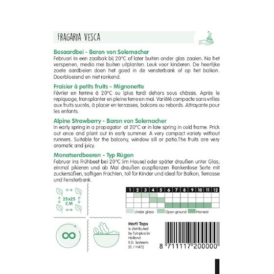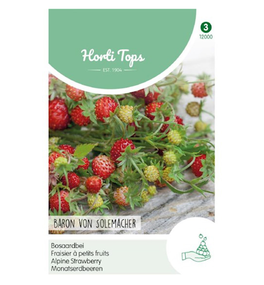 Charakteristika:Obľúbená odroda alpských jahôd ´Baron von Solemacher´ sa vyznačuje neustálym kvitnutím a plodením od jari až do neskorej jesene. Plody jahôd sú kuželovitého tvaru, jasnej červenej farby. Chuť jahôd je výraznejšia a sladšia, pripomína chuť lesných jahôd.