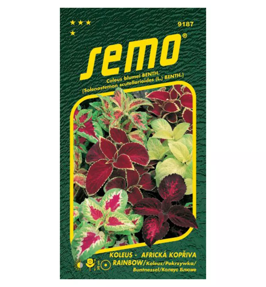 Charakteristika: Koleus ´Rainbow´ poznáme aj pod názvom "Africká pŕhľava". V našich podmienkach sa pestuje ako letnička v balkónových výsadbách alebo ako izbová rastlina. Balenie obsahuje semená farebných kultivarov koleusu s mimoriadne dekoratívnymi listami, ktoré vyzerajú dokonale nielen samostatne ale tiež v ich vzájomných kombináciach.