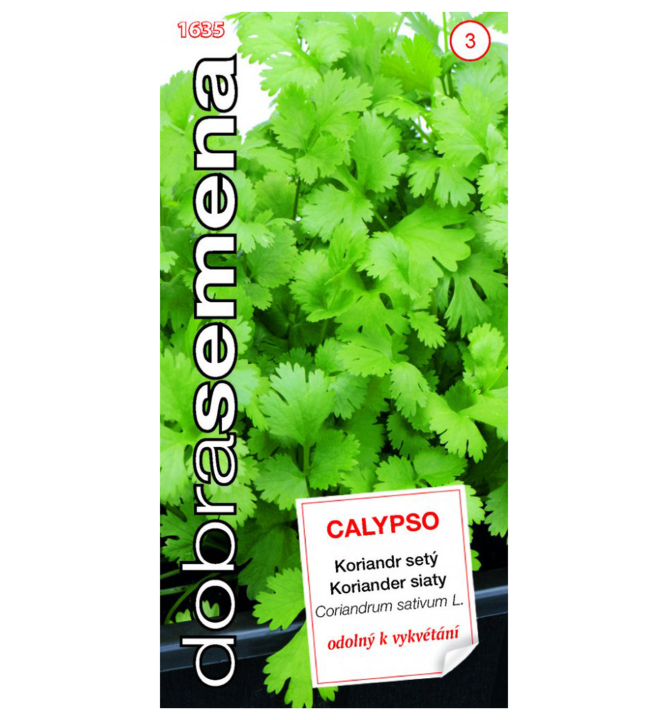 Charakteristika: Koriander pôvodne pochádza z východného Stredomoria a západnej Ázie. Odroda ´Calypso´sa pýši veľmi veľkou odolnosťou, voči vybiehavosti do kvetu. Je to cca 50-60 cm vysoká rastlina, listy sú podobné petržlenu a majú silnú arómu. Z rastliny sa využívajú vňať i suché plody. Plody sú hnedej farby a majú príjemne aromatickú, nasladlú, jemne pikantnú chuť.