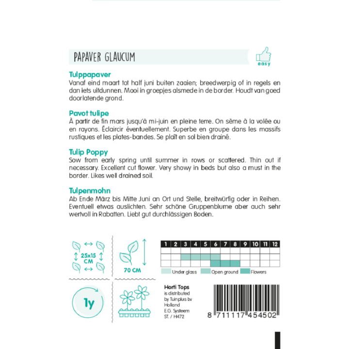 Pestovanie: Semená maku vysievame od konca marca do júna priamo na vybrané stanovisko. Semená do pôdy jemne zatlačíme, v prípade potreby rastliny po vyklíčení pretriedime a ponecháme rásť najsilnejšie. Tento kultivar vyžaduje slnečné stanovisko a priepustnú, mierne vlhkú pôdu.