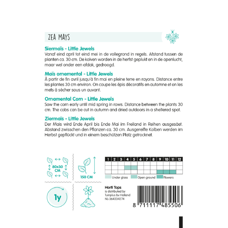 Charakteristika: Okrasná kukurica ´Little Jewels´ vyniká unikátnym vzhľadom zŕn, ktoré môžu mať purpurové až čierne sfarbenie. Mix semien okrasnej kukurice obsahuje niekoľko variácií sfarbenia, ktoré sa využívajú najmä v aranžérstve na vytvorenie pôsobivých letných a jesenných dekorácií. Tento kultivar rastie do výšky približne 1,5 m.