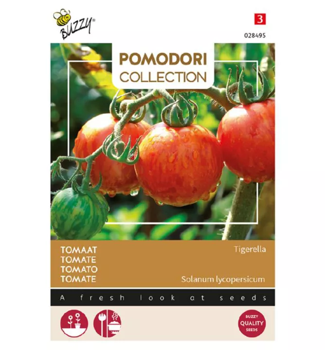 Charakteristika: Odroda ´Tigerella´ je pôvodnou odrodou pochádzajúcou z Anglicka. Ide o skorú kolíkovú odrodu, ktorú je možné pestovať na záhrade aj v skleníku. Produkuje okrúhle plody veľkosti 3,5–4 cm, ktoré majú sýtočervenú farbu s oranžovými pruhmi. Plody sú pikantné a príjemne spestria bežné zeleninové šaláty či obložené misy. Môžete ich ale využiť aj na prípravu omáčok.