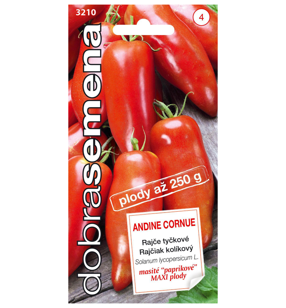 Charakteristika: Rajčiak kolíkový ´ANDINE CORNUE´ je francúzska odroda s dlhými, paprikovo tvarovanými plodmi, ktoré dosahujú dĺžku až 18 cm. Ich sýto červená farba a jemná, sladkastá chuť sú ideálne pre čerstvé šaláty, sendviče alebo ako základ pre lahodné omáčky a salsy. Vyniká nielen svojím vzhľadom, ale aj vysokou úrodnosťou a odolnosťou voči chorobám. Vhodná na pestovanie v skleníkoch i vonku.