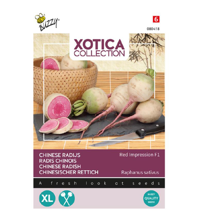 Charakteristika:Odroda ´RED IMPRESSION F1´plodí okrúhle reďkovky, ktoré sú zvonku biele/svetlozelené, ale vnútro má ružový odtieň. Dužina je šťavnatá s jemnou korenistou chuťou a chrumkavou textúrou. Dorastajú do veľkosti 7 až 9 cm a sú ideálne na použitie do farebných šalátov.