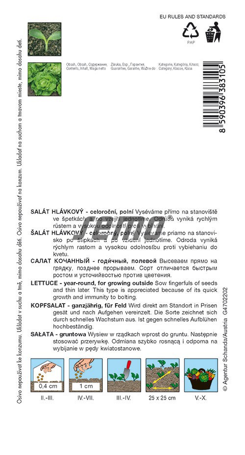 Pestovanie: Pestuje sa z priesady alebo z priameho výsevu na stále miesto. V závislosti od zamýšľaného obdobia zberu a charakteru stanoviska na pestovanie sa semená vysievajú od 2. polovice februára. Mrazuvzdornosť sa uvádza do -5°. Šalát vysádzame do úrodnej, humóznej, neokyslenej a kyprej pôdy, na slnečné, teplé stanovisko.