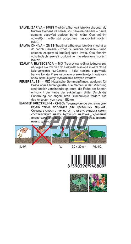 Charakteristika: Okrasná šalvia je rýchlo rastúca letnička pre skupinové záhonové výsadby vhodná aj do okenných debničiek. Kolekcia ´Paleta farieb´ obsahuje zmes odtieňov bielej, lososovej a levanduľovej farby rúrkovitých kvetov. Semená v zmesi sú farebne rozlíšené, farba semien zodpovedá farbe kvetov rastliny, ktorá z nich vyrastie.