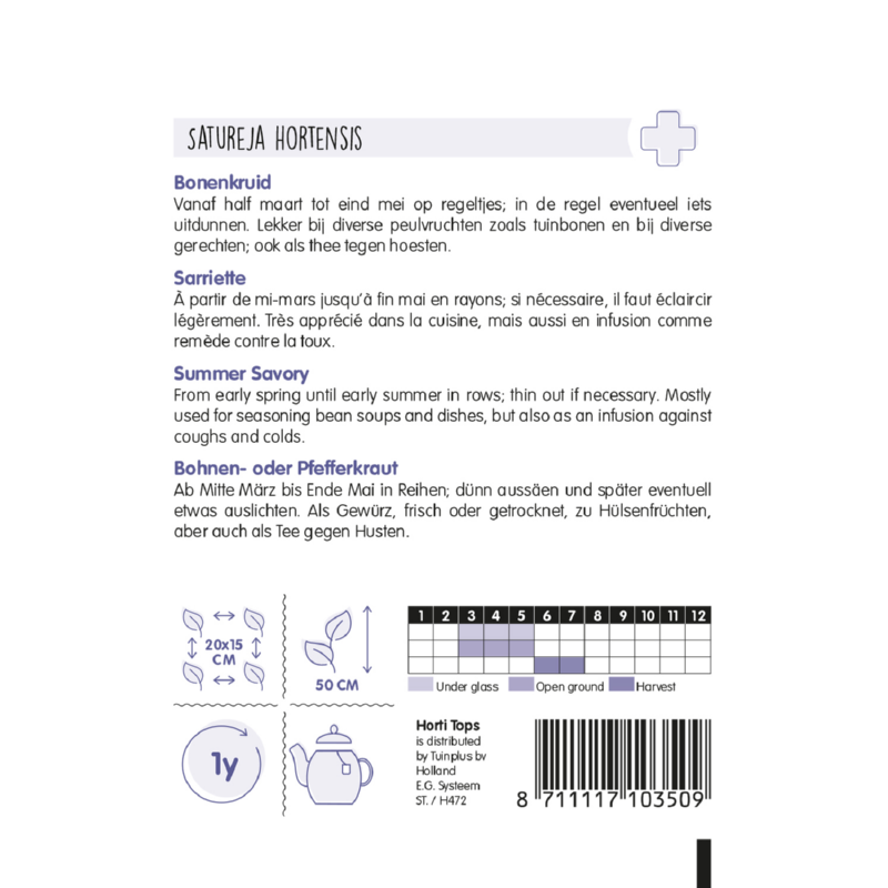 Charakteristika: Saturejka záhradná je nielen liečivá rastlina, ale aj mimoriadne obľúbená korenina s výraznou až ostrou chuťou. Vytvára hustý mini ker s množstvom aromatických úzkych listov. Využíva sa najmä na ochutenie pokrmov zo strukovín. Jej liečivé účinky sa prejavujú pri liečbe kašľa, nachladnutia a tráviacich problémov.