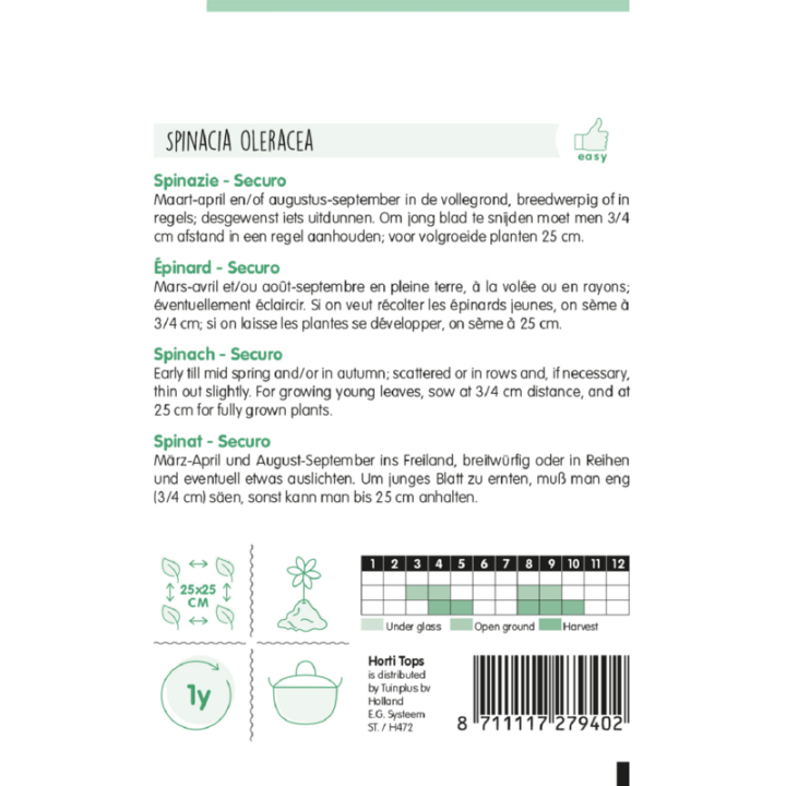 Charakteristika:Špenát ´SECURO´ je rýchlorastúca odroda špenátu, vhodná na skorú a neskorú sejbu. Tmavozelené, hladké listy s bohatou chuťou sú mimoriadne vhodné do zapekacích mís, na varenie, dusenie, ale aj ako prílohová zelenina. Zelené listy špenátu sa môžu pochváliť bezkonkurenčným synergickým doplnkom vitamínov, minerálov, flavonoidov a karotenoidov, ktoré pri tejto kombinácii chránia zrak, pomáhajú predchádzať tvorbe cholesterolu a zamerať sa na voľné radikály spôsobujúce rakovinu.