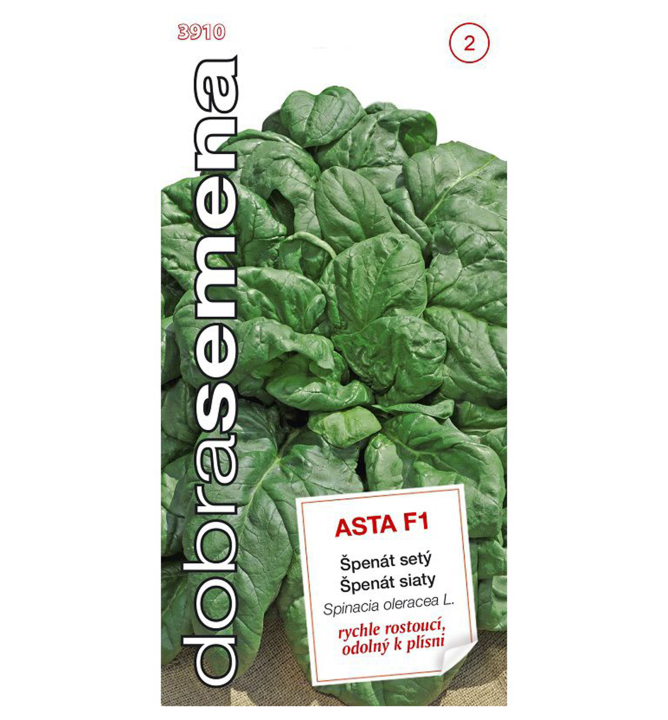 Charakteristika: Špenát siaty ´ASTA´ je hybridný špenát s odolnosťou k dvom rasám plesne špenátové. Je vhodný pre jarné a jesenné pestovanie aj na prezimovanie. Vysievajte ako predplodinu alebo následnú kultúru, má krátku vegetačnú dobu a môžete ho zberať už 5 ¦ 7 týždňov od výsevu. Listy majú silnú a bohatú chuť, pre ktorú je perfektný do zapekacích mís, varenie, dusenie, ale aj ako prílohová zelenina. Zelené listy špenátu sa môžu pochváliť bezkonkurenčným synergickým doplnkom vitamínov, minerálov, flavonoidov a karotenoidov, ktoré pri tejto kombinácii chránia zrak, pomáhajú predchádzať tvorbe cholesterolu a zamerať sa na voľné radikály spôsobujúce rakovinu.