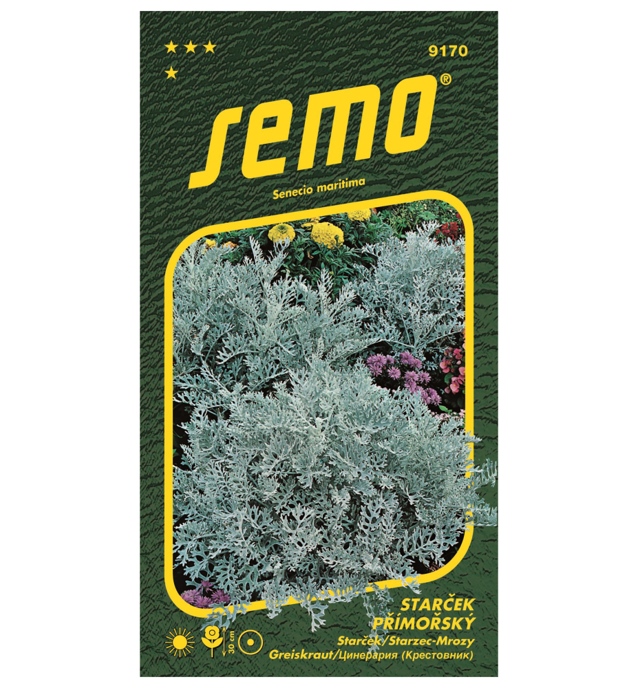 Charakteristika: Starček prímorský ´Silverdust´ je trváci poloker pestovaný ako letnička. Prízemná ružica striebristo bielych, vykrajovaných listov vytvára zaujímavý kontrast v pravidelných ornamentálnych výsadbách. Malé úbory žltých kvetov rozkvitajú v lete. Ratlina dorastá do výšky 20 cm.