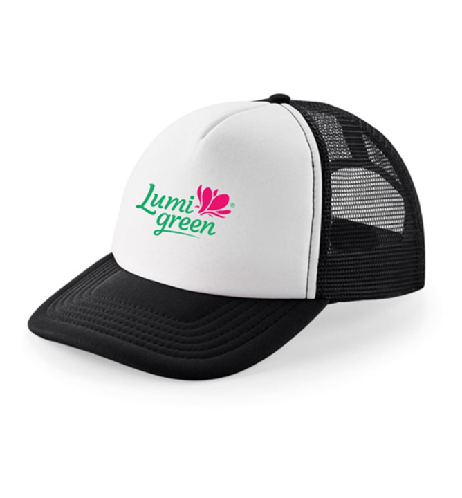 Čierno biela šiltovka so sieťovanou zadnou stranou s logom LUMIGREEN.