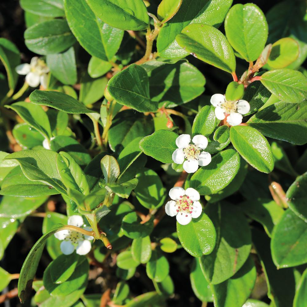 Vždyzelený skalník na kmienku s bielymi kvetmi a červenými plodmi.