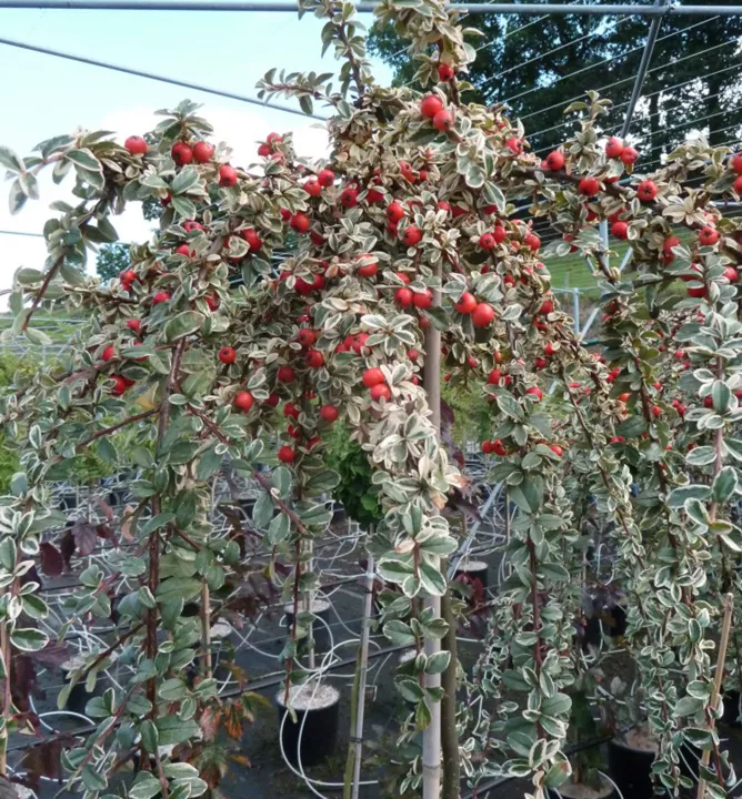 Charakteristika: Atraktívny a nenáročný skalník ´JULIETTE´ na kmienku zaujme svojimi prevísajúcimi výhonmi, ktoré sú zdobené bielo panašovanými listami. Na jeseň sa biele panašovanie prefarbuje do ružova. V júni až júli kvitne bielymi kvetmi, z ktorých sa na jeseň tvoria oranžovočervené guľovité plody. Je ideálny na pestovanie v malých záhradách alebo v črepníku.