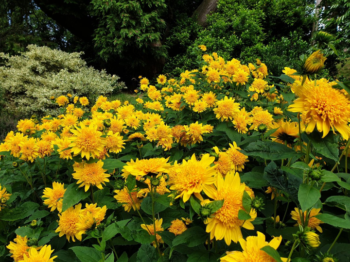 Vysoká slnečnica s nápadnými plnými kvetmi zlatožltej farby.