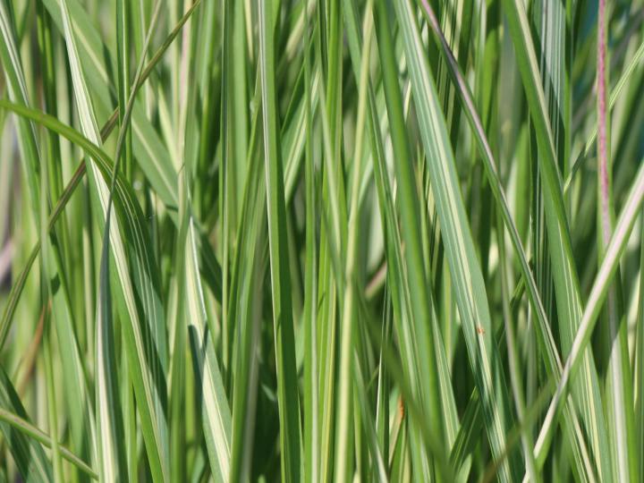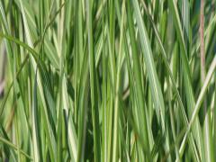Vždyzelená vlhkomilná tráva so zelenými listami a smotanovobielymi pruhmi.