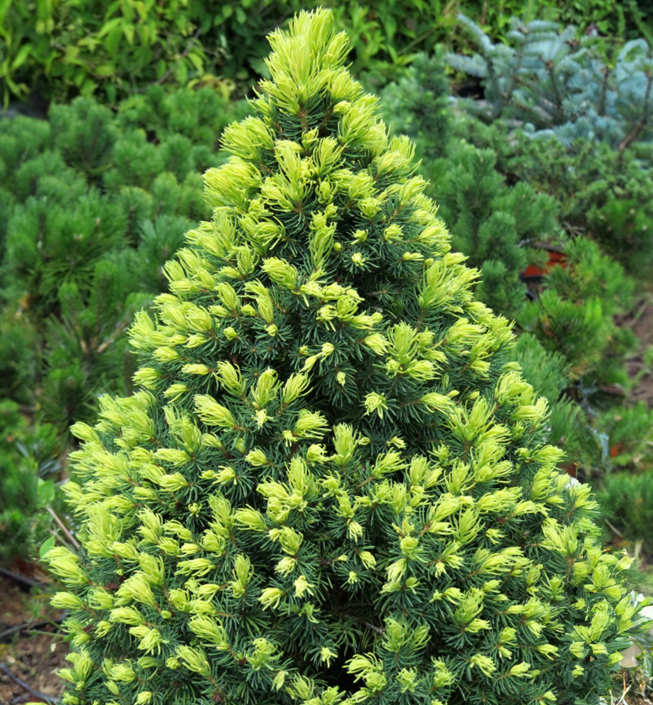 Nádherný pravidelne rastúci smrek so zlatistými mladými výhonmi.