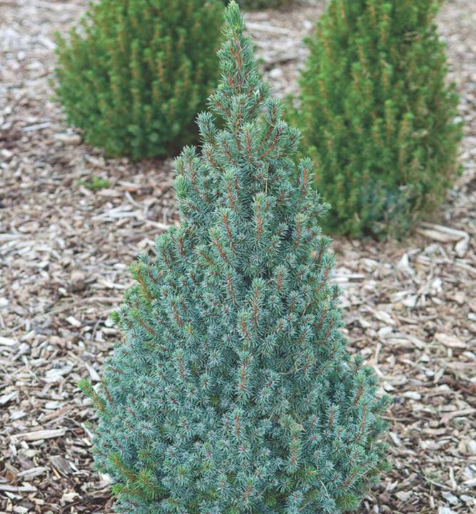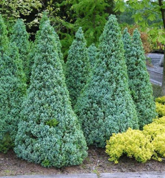 Obľúbený trpasličí smrek pravidelného tvaru s oceľovo modrými výhonmi.