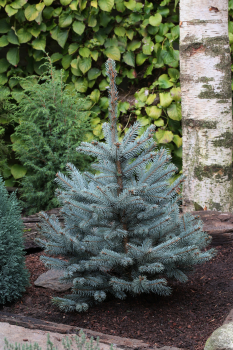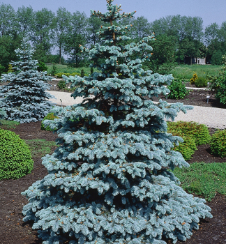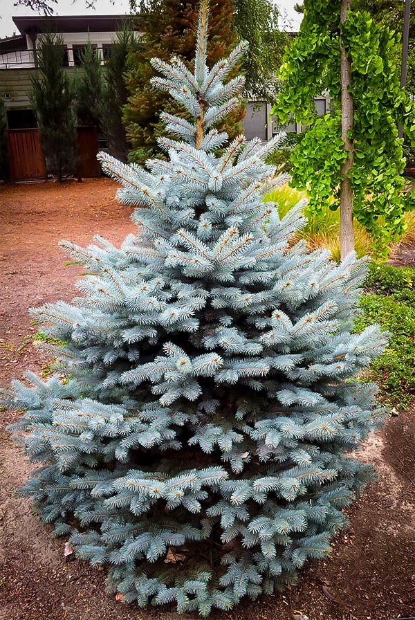 Široko kužeľovitý vysoký smrek s kontrastným dvojfarebným ihličím.