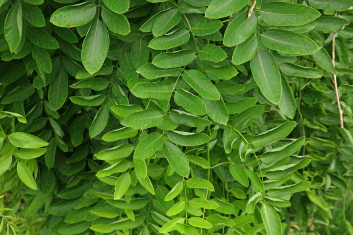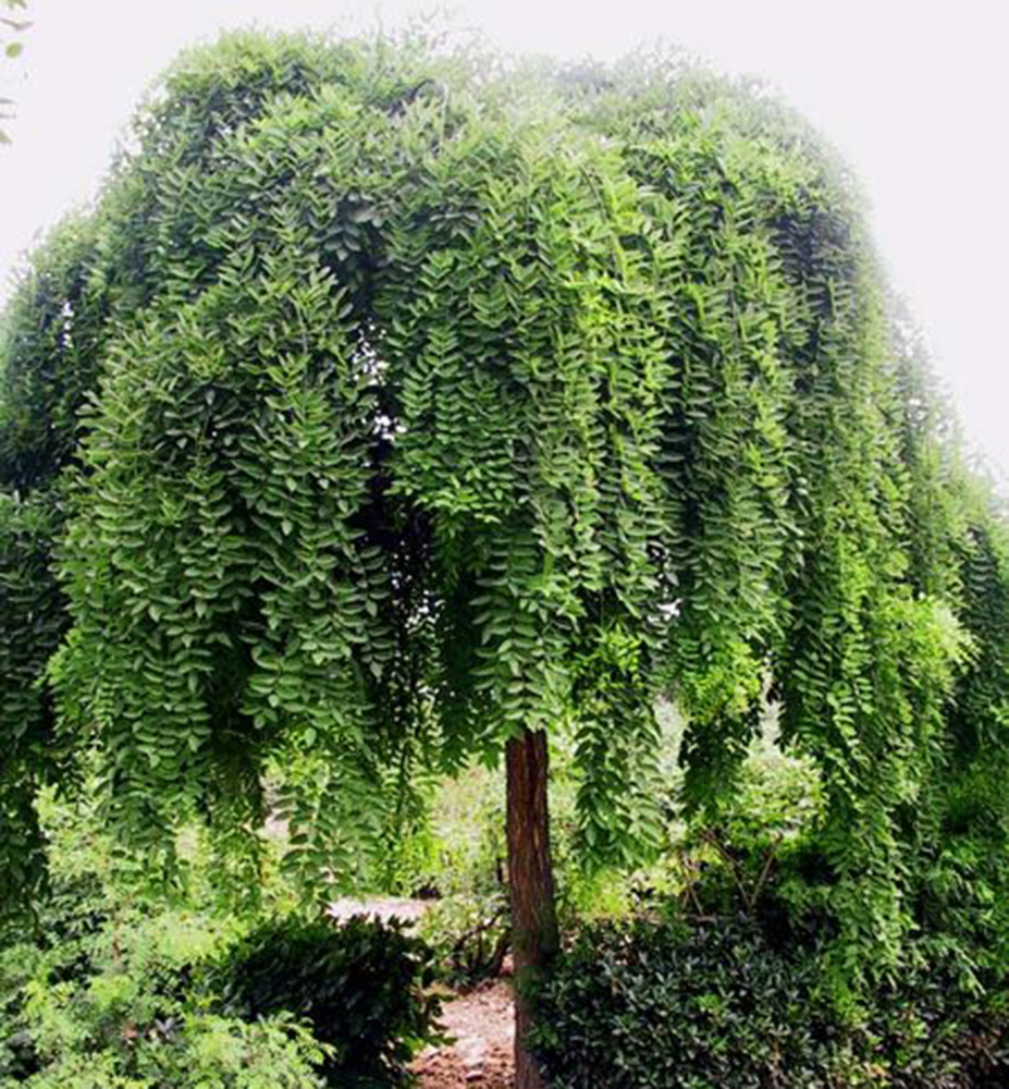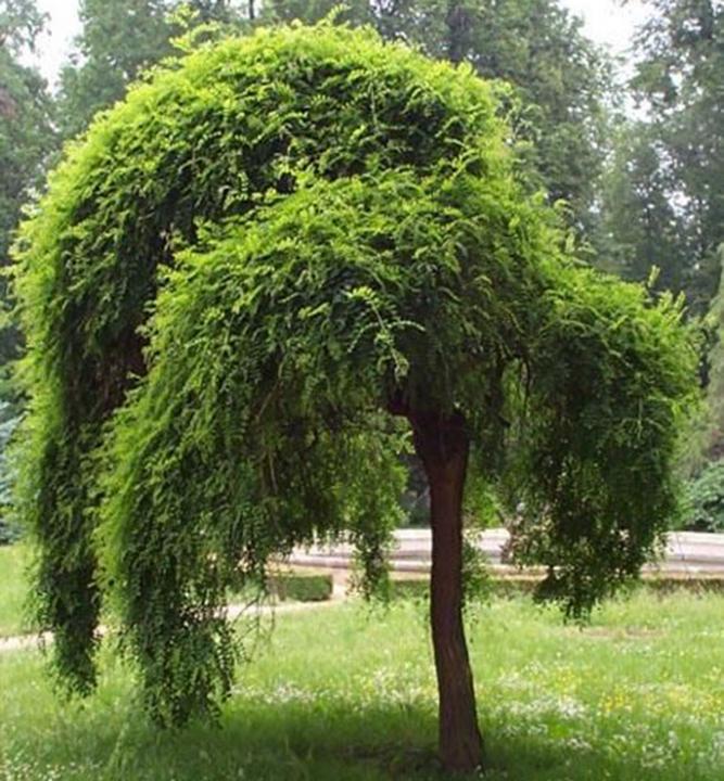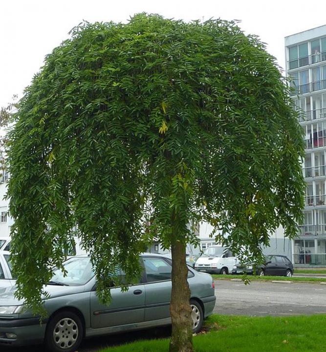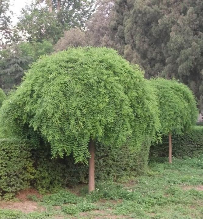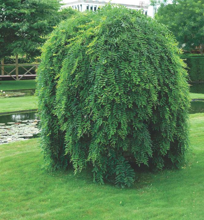 Okrasný strom s pravidelnou guľovitou korunou a zaujímavou kôrou.