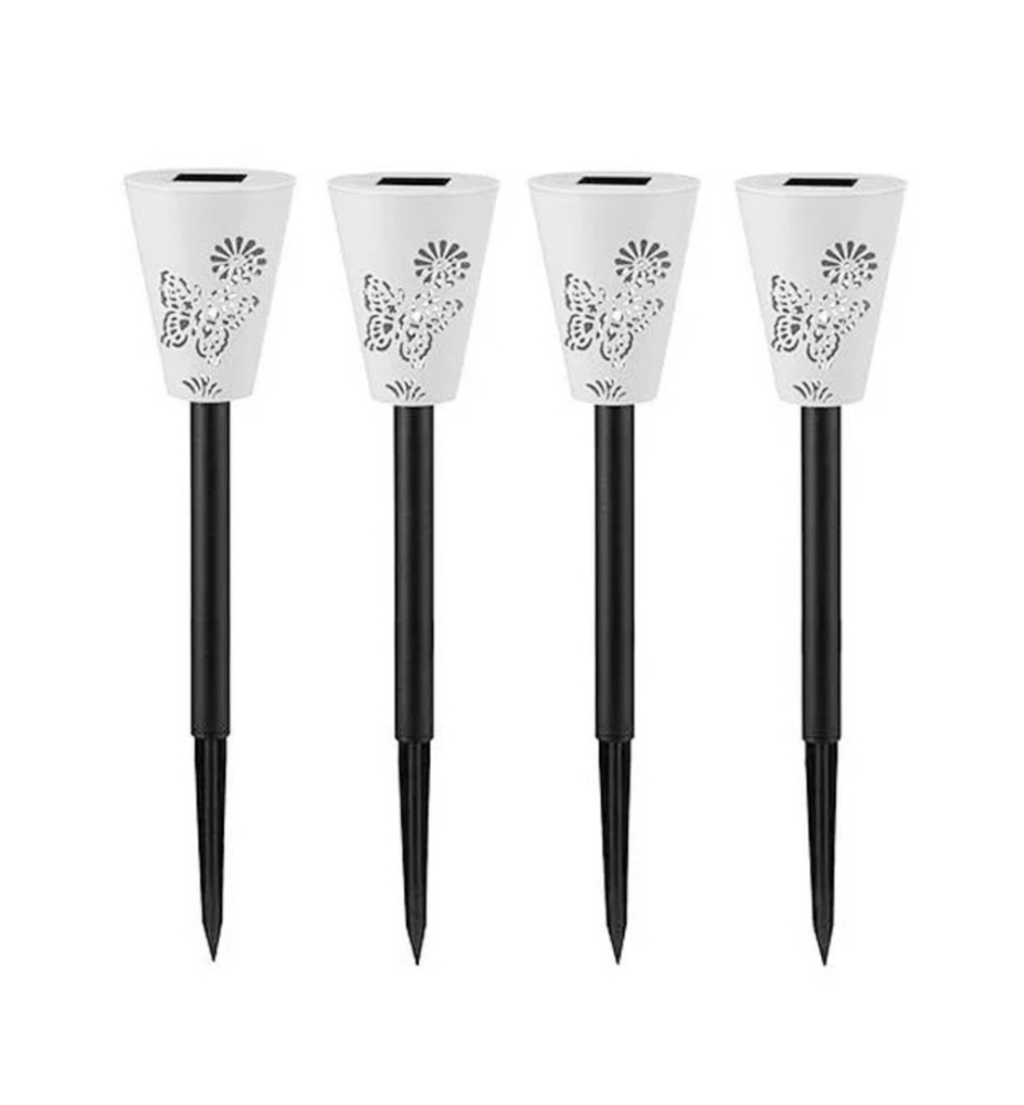 Záhradné solárne lampy so studeným bielym alebo farebným led svetlom a siluetou motýľa.