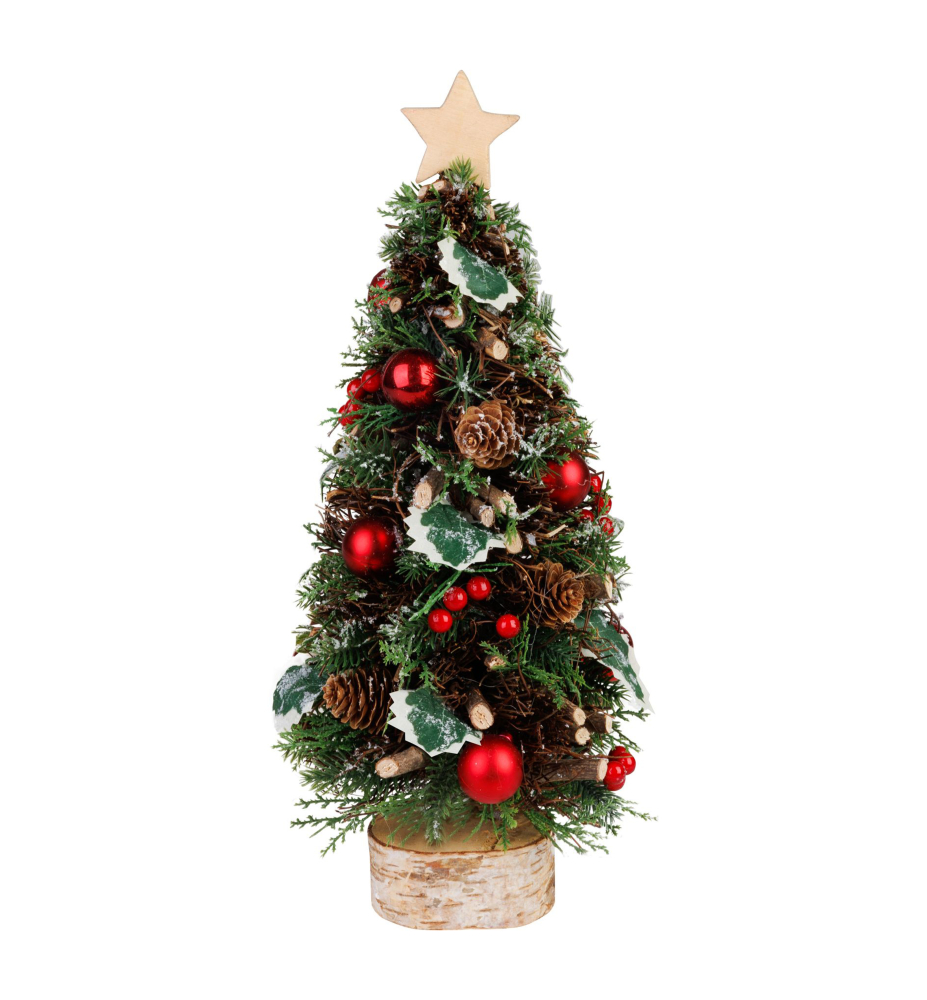Charakteristika: Pridajte sviatočný šarm do vášho interiéru s týmto malým vianočným stromčekom na podstavci. S výškou 40 cm a praktickými rozmermi 18 x18 cm. Tento stromček je ozdobený elegantnou hviezdou na vrchole, čo mu dodáva špeciálny vianočný nádych. Ideálny na stôl alebo menšie plochy.