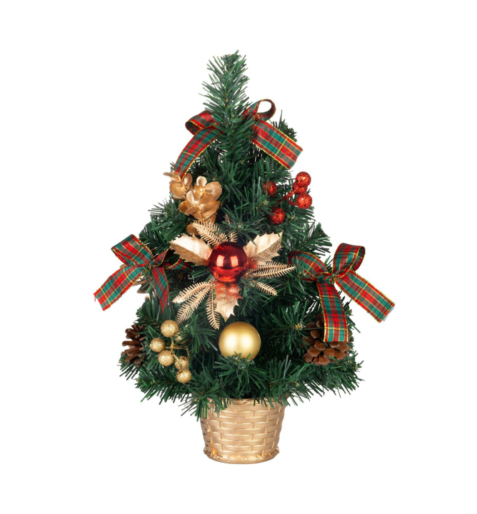 Charakteristika: Tento krásne zdobený vianočný stromček s výškou 40 cm je umiestnený v dekoratívnom črepníku a doplnený o tradičné ozdoby, mašle a prírodné prvky, ktoré podčiarkujú jeho jedinečný vzhľad. Stromček je ideálny na ozdobenie stola, poličky alebo ako súčasť vianočnej výzdoby v menších priestoroch. Vďaka svojmu praktickému rozmeru sa hodí do každej domácnosti a prinesie do nej kúzlo Vianoc.