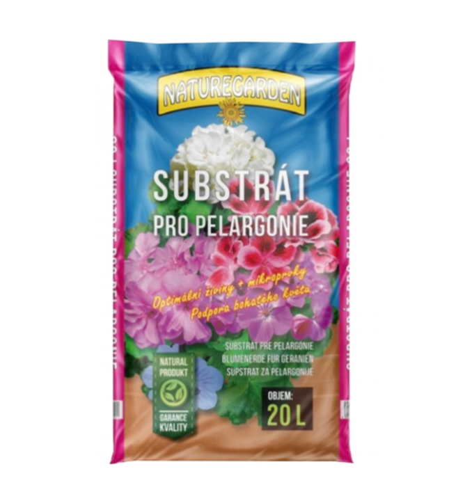 Charakteristika:Substrát je určený pre pelargónie a ďalšie balkónové kvety náročné na živiny a vyžadujúce slabo kyslú až neutrálnu pôdnu reakciu. Vyrobený zo zmesi kvalitné rašeliny a vyhnojených kompostov. Svojimi vlastnosťami zaisťuje substrát prevzdušnenie koreňové štruktúry. Obsahuje optimálnu hladinu hnojív pre pelargónie a rastliny náročné na živiny. Pre ešte bohatší rast je vyhnojený fosfátovým sklom. Vo väčšom balení je použitý Humát draselný.