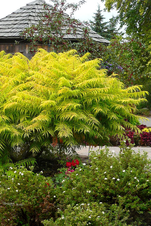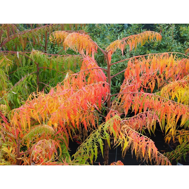 Charakteristika: Sumach pálkový ´TIGER EYES®´ je výrazný opadavý okrasný ker, vyznačujúci sa pomalším rastom. V dospelosti jeho výška nepresahuje 2 m, vďaka čomu je vhodný aj do menších záhrad. Rastie ako rozložitý ker s nepravidelne rastúcimi, jemne previsnutými výhonmi a výrazne architektonickým habitusom. Veľké, hlboko strihané perovité listy rašia na jar v jasných žltozelených až zlatožltých odtieňoch, ktoré si rastlina zachováva počas celej vegetačnej sezóny. Na jeseň sa listy spoľahlivo vyfarbujú do intenzívnych oranžových, červených až šarlátových tónov, čím sa stáva výrazným sezónnym akcentom v záhrade.