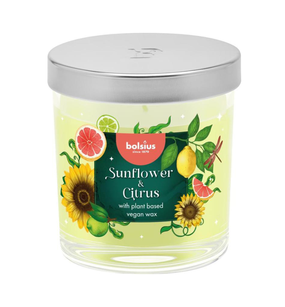 - Sviečka BOLSIUS Floral Fusion SLNEČNICA A CITRUS, v skle, 80/72 mm