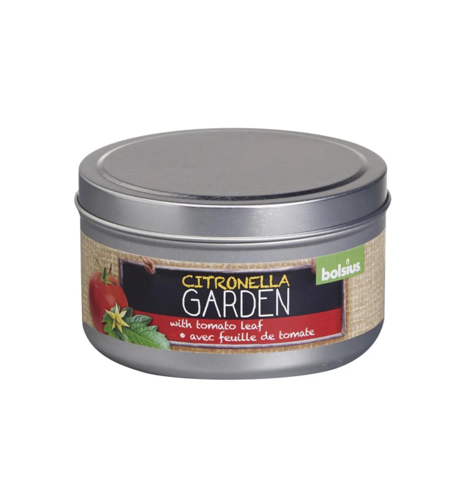 Repelentná sviečka v plechovej dóze s citrusovou vôňou s nádychom paradajkového listu.