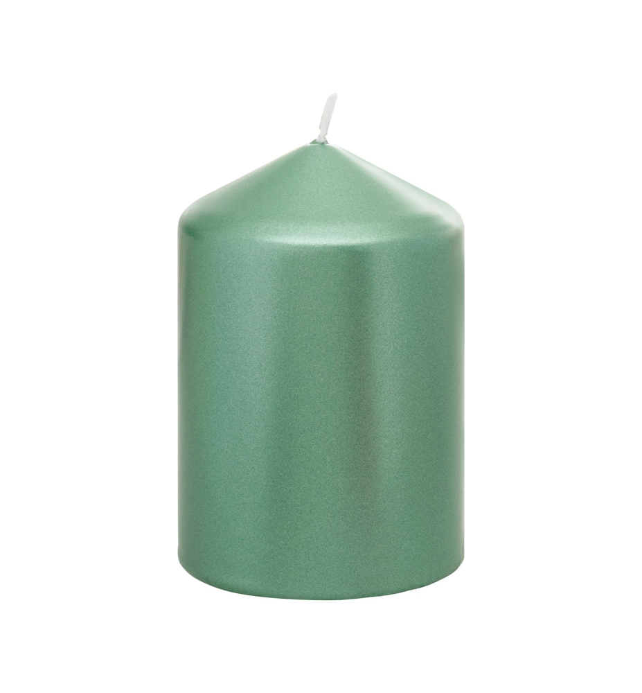 Dekoračná sviečka v tvare valca zelenej farby s metalickým efektom.