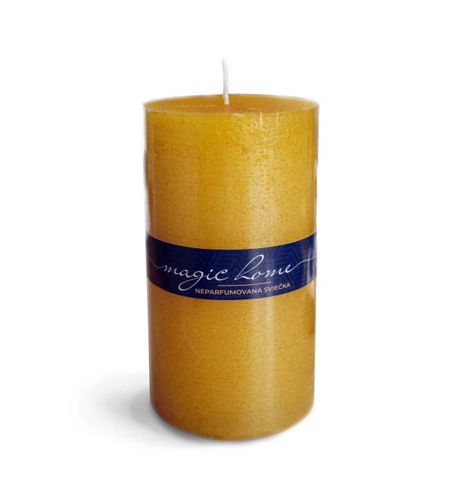 Dekoračná sviečka v tvare valca v zlatej farbe.